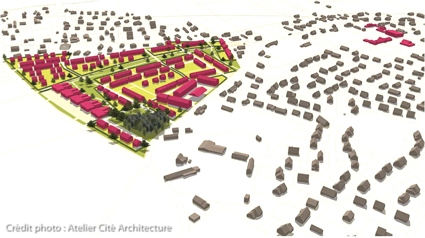 Périmètre : 10 ha – SdP : 16 000 m² – 120 logements – 2 500 m² d’activités